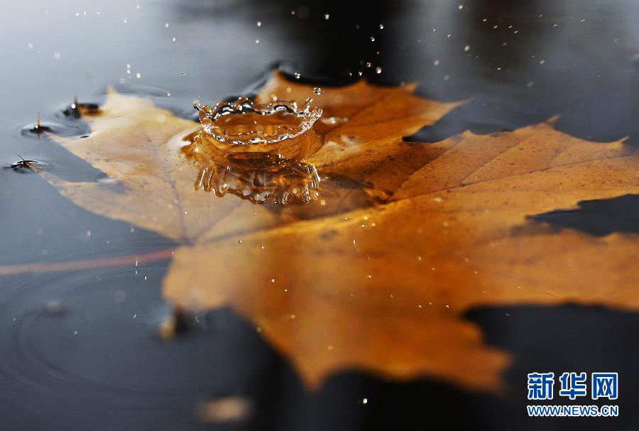 A drop of water falls on a piece of yellow maple in Vienna, Austria. (Xinhua/Reuters)