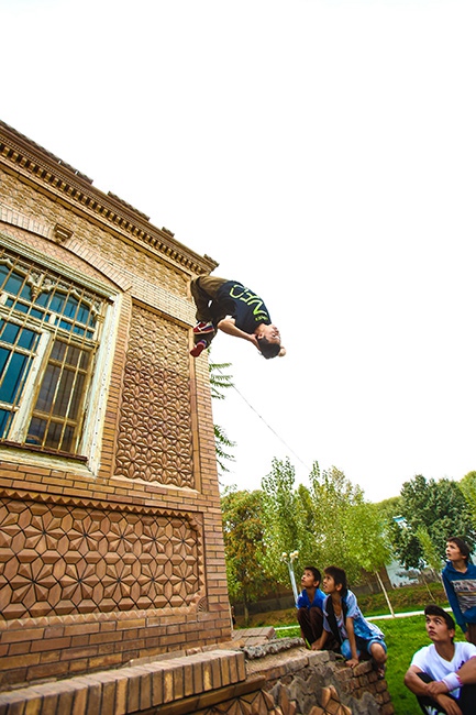 Abdusalam practices backward somersault with the help of wall at Kashgar People's Park on Sept. 25, 2014. He hoped to be one of the top three in the national final with the help of highly challenging movements. He said that he wanted to open a professional parkour training center. (Xinhua/Wu Zhuang) |