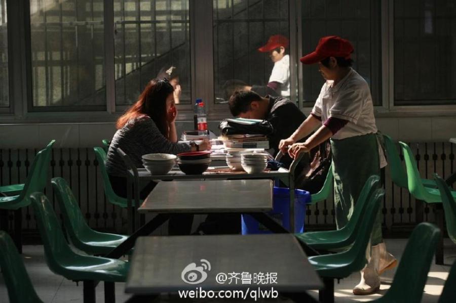 The photo shows students of a university in Jinan, east China's Shandong province, studying in the school canteen to prepare for the postgraduate entrance examination. According to a student, there is only one classroom building nearby, and most of its classrooms were already occupied for lectures. [Photo: weibo.com/qlwb]