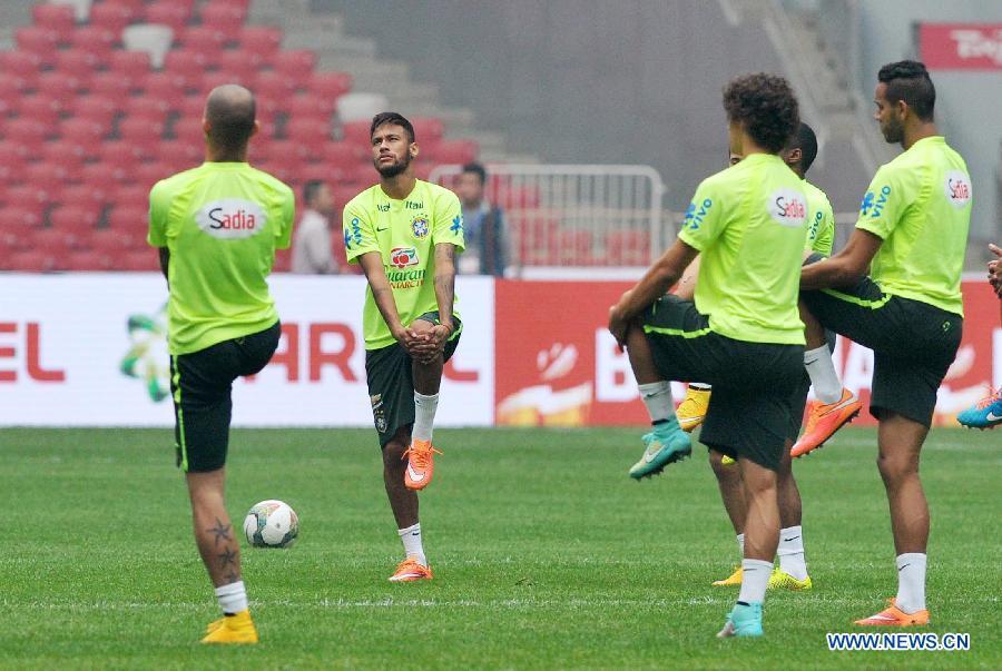 Brazil's Naymar (2nd L) attends a training session one day before a friendly football match between the Brazilian and Argentinian national teams in Beijing, capital of China, Oct 10, 2014. (Xinhua/Gong Lei)