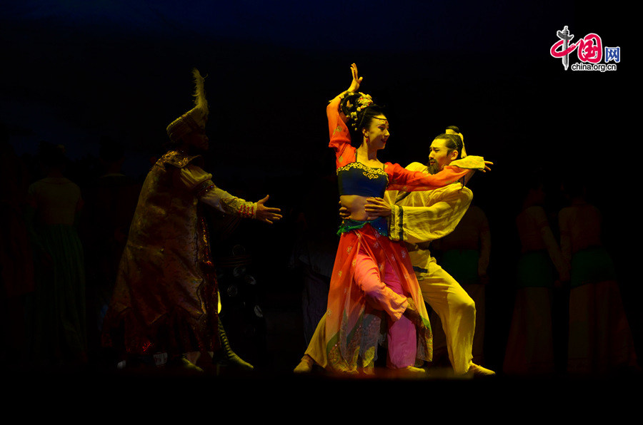 Artists perform the dance drama "Silk Road" in Lanzhou on Thursday, Oct. 9, 2014, as part of the activities marking the 3rd International Culture Industry Conference, which is being held in the city. [Photo by Su Yadong / China.org.cn] |