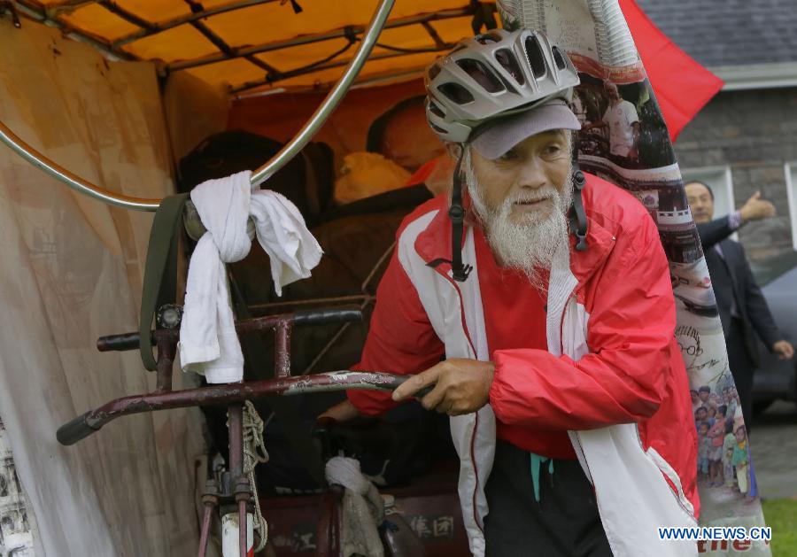 Olympic rickshaw rider Chen Guanming is seen with his tricycle in Vancouver, Canada, Oct. 10, 2014. Chinese 58-year-old farmer Chen Guanming pedalled his rickshaw to 18 countries in the past 13 years. He will take his route from Canada to Brazil to mark his 3rd attendance of the Olympic Games venue in Rio de Janeiro in 2016 after the London and Beijing Olympic Games. His journey is aimed at bringing Olympic spirit and national pride to people across the world and also raise the awareness of environment protection. (Xinhua/Liang Sen)