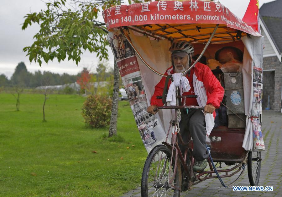 Olympic rickshaw rider Chen Guanming is seen with his tricycle in Vancouver, Canada, Oct. 10, 2014. Chinese 58-year-old farmer Chen Guanming pedalled his rickshaw to 18 countries in the past 13 years. He will take his route from Canada to Brazil to mark his 3rd attendance of the Olympic Games venue in Rio de Janeiro in 2016 after the London and Beijing Olympic Games. His journey is aimed at bringing Olympic spirit and national pride to people across the world and also raise the awareness of environment protection. (Xinhua/Liang Sen)