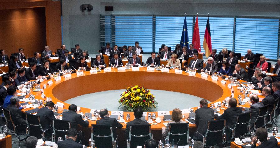 Chinese Premier Li Keqiang and German Chancellor Angela Merkel co-chair the third round of bilateral governmental consultations in Berlin, Germany, Oct. 10, 2014. (Xinhua/Li Xueren)