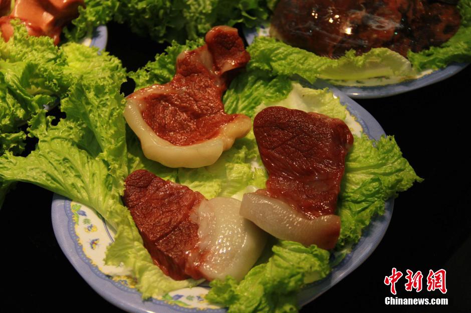A Chinese feast made from stone debuts in Xi’an, northwest China’s Shaanxi province on Oct. 10, 2014. The delicacies are so vivid that they would make one’s mouth water. The whole feast sells at 360,000 yuan. (Chinanews/Zhang Yicheng)