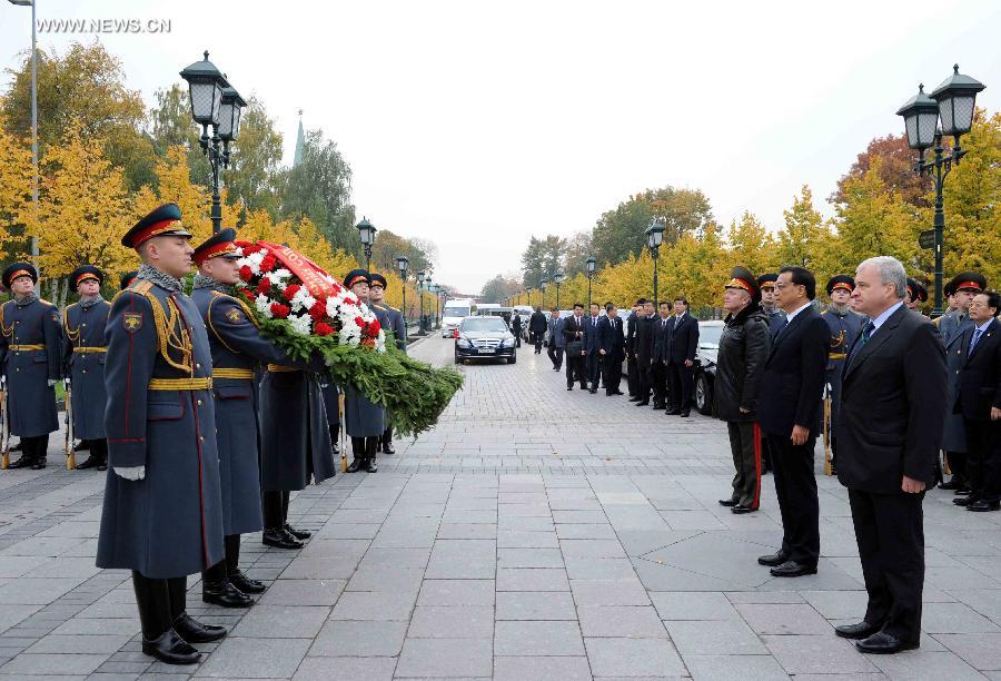 Chinese Premier Li Keqiang (2nd R, front) lays a wreath to the Tomb of the Unknown Soldier in Moscow, capital of Russia, Oct. 13, 2014. (Xinhua/Rao Aimin)