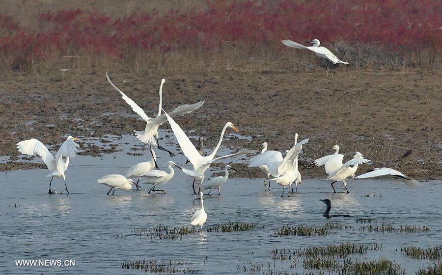 Egrets are seen on a wetland of the port city Qinhuangdao in north China's Hebei Province, Oct. 11, 2014. Thanks to the environment protection, the wetland has become a habitat to rest for over 10 million migrating birds yearly. (Xinhua/Yang Shiyao)