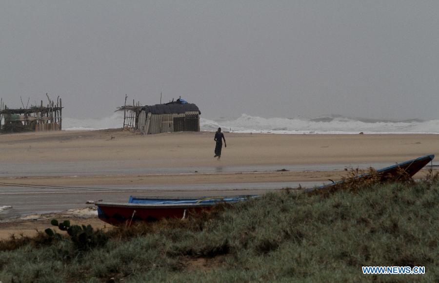 A villager walks through strong winds at the Bay of Bengal coast in Gopalpur, east India's state of Orissa, on Oct. 12, 2014. At least six people were killed Sunday when severe cyclone "Hudhud" hit the east coast of India with winds of almost 200 kmph, said officials. (Xinhua/Stringer) |