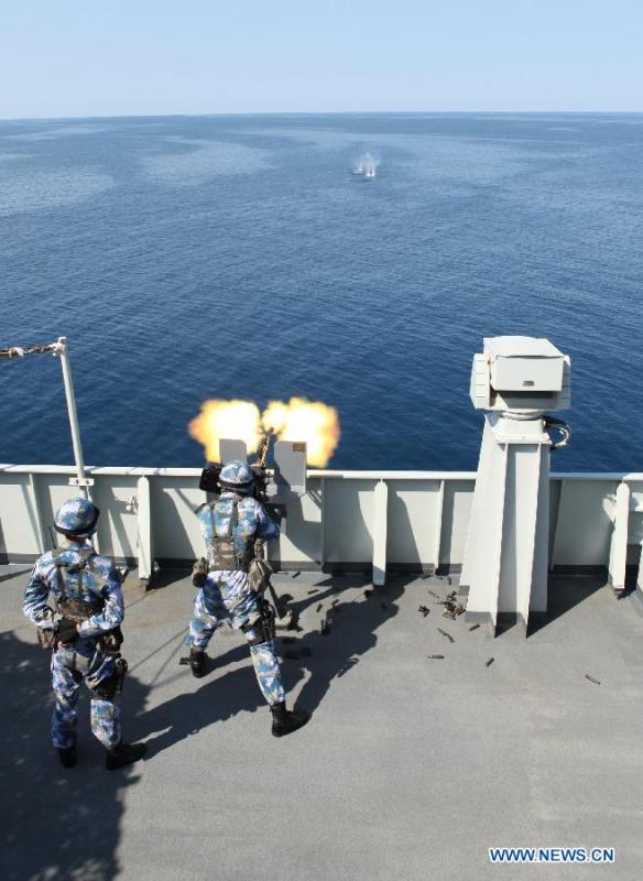 Soldiers of Chinese People's Liberation Army Navy take part in a shoot training on Changbaishan warship, October 11, 2014. Changbaishan warship is part of the 18th batch of convoy fleet sent by the Chinese People's Liberation Army Navy for escort missions in the Gulf of Aden. (Xinhua/Zhang Yuelin) |