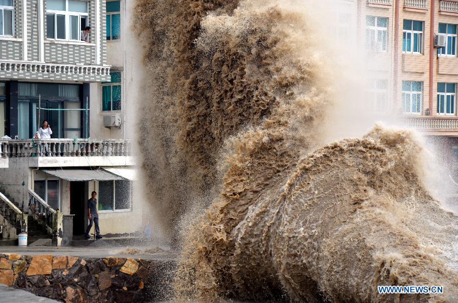 High waves are seen in Shitang Township, Wenling, east China's Zhejiang province, Oct 12, 2014. Affected by the powerful typhoon Vongfong, high waves were seen off the coast of provinces like Zhejiang and Fujian. (Xinhua/Jin Yunguo)