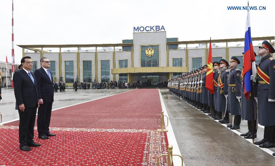 Chinese Premier Li Keqiang (1st L) attends a welcoming ceremony upon his arrival at an airport in Moscow, Russia, Oct. 12, 2014. Li arrived here Sunday afternoon for an official visit to Russia and he will attend the 19th China-Russia Prime Ministers' Regular Meeting. (Xinhua/Li Xueren) |