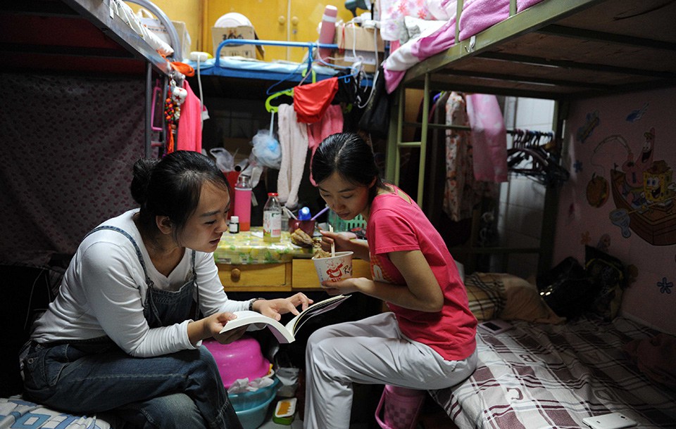 Wang shares working experience with another nurse in her hospital dormitory. Wang keeps learning apart from busy work. (CNTV/Wang Zhe)