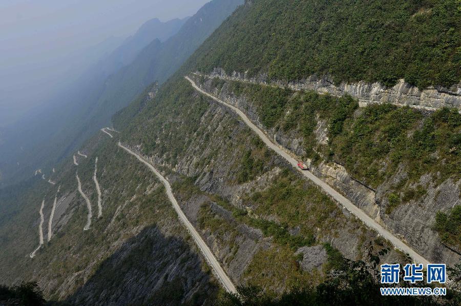 A car moves on a rural road built clinging to the absolutely vertical cliff of a mountain in Enshi Tujia and Miao Autonomous Prefecture, Central China's Hubei province on Sunday, October 12, 2014. The treacherous winding road has been called “path hung on cliff.” [Photo/ Xinhua] |