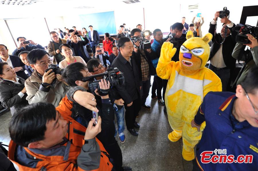 An unidentified lottery winner comes forward to claim his gigantic Dual-colored Ball jackpot at a welfare lottery issuing center in Taiyuan, Shanxi province on Monday, October 13, 2014. [Photo: China News Service/ Wei Liang]