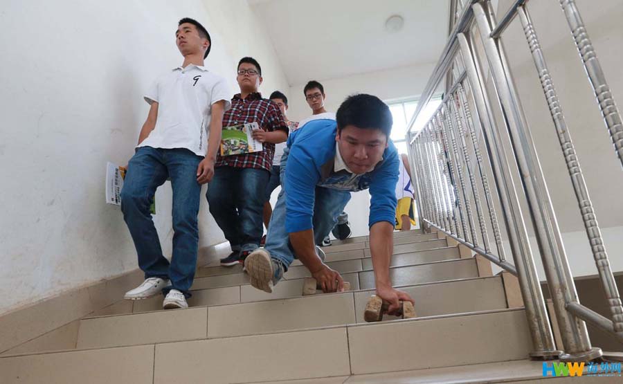 “My feet have shrunk, but that's not necessarily a bad thing. It has given me the incentive that inspires me to overcome every difficulty.” Xiaole says that one of the hardest things for him is to go down stairs - he needs to go down two steps at a time. “Because the distance between a single step is too short, it's hard for me to keep my balance. So I have to concentrate, and balance my body using my hands. When classmates call me, I don't dare answer - I have to concentrate on every step.” (Photo/Haiwainet) |