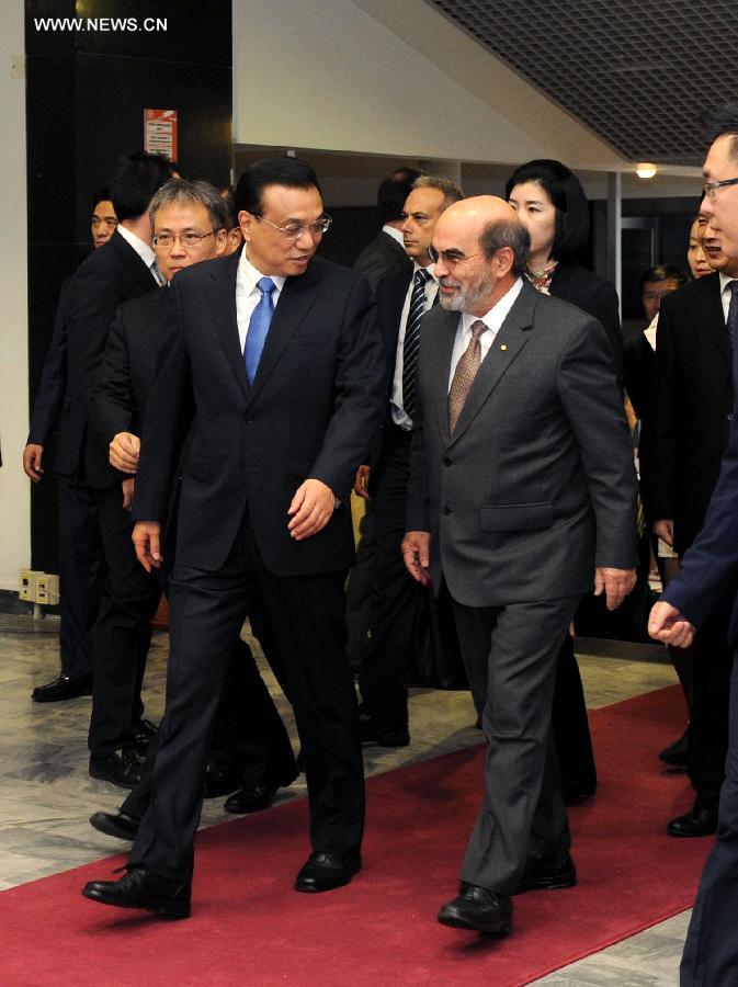 Chinese Premier Li Keqiang (L) meets with Jose Graziano da Silva, director-general of the UN Food and Agriculture Organization (FAO), in Rome, Italy, Oct. 15, 2014. (Xinhua/Rao Aimin)