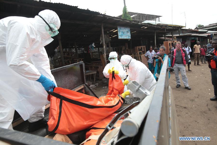 Health workers load a body infected with Ebola virus onto a pickup truck in Monrovia, capital of Liberia on Oct. 14, 2014. (Xinhua/Marcus DiPaola)