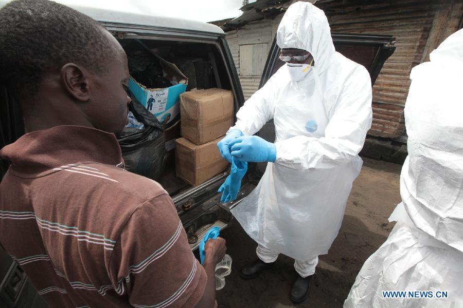 Members of a Liberian Red Cross unit wear protective gear as they prepare to go into a house where an Ebola patient died in Monrovia, capital of Liberia on Oct. 14, 2014. (Xinhua/Marcus DiPaola)