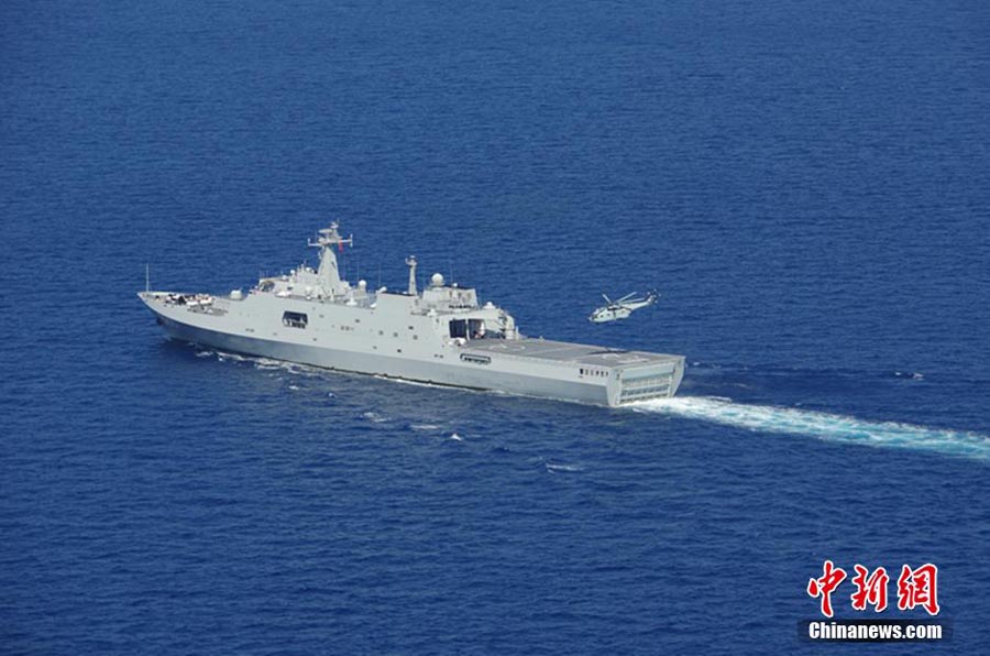 The Chinese naval escort fleet executing escort mission in the Gulf of Aden carries out ship-based helicopter flight training on Oct. 13, 2014. In view of the characteristics of the recent pirate activities, the fleet aims to improve the ability to deal with emergency situation through the training. (Chinanews.com/Xiao Yong) |