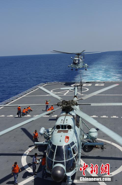 The Chinese naval escort fleet executing escort mission in the Gulf of Aden carries out ship-based helicopter flight training on Oct. 13, 2014. In view of the characteristics of the recent pirate activities, the fleet aims to improve the ability to deal with emergency situation through the training. (Chinanews.com/Xiao Yong)