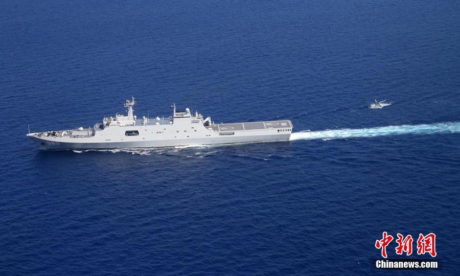 The Chinese naval escort fleet executing escort mission in the Gulf of Aden carries out ship-based helicopter flight training on Oct. 13, 2014. In view of the characteristics of the recent pirate activities, the fleet aims to improve the ability to deal with emergency situation through the training. (Chinanews.com/Deng Minghua) |