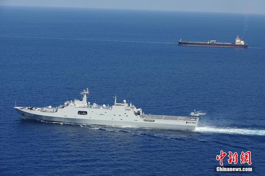 The Chinese naval escort fleet executing escort mission in the Gulf of Aden carries out ship-based helicopter flight training on Oct. 13, 2014. In view of the characteristics of the recent pirate activities, the fleet aims to improve the ability to deal with emergency situation through the training. (Chinanews.com/Xiao Yong) |