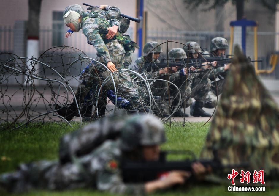 Norman Bethune Non-Commissioned Officer Medical School conducts adaptive medical exercise in Shijiazhuang, north China's Hebei province on Oct. 10, 2014. (CNS/Song Jihe)
