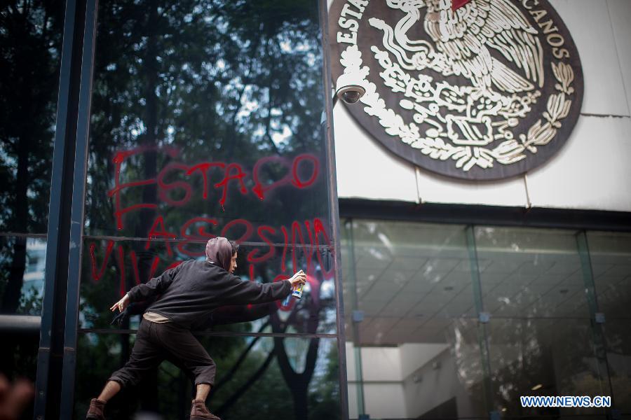 A man paints a wall during a protest for the 43 missing students of the Rural Normal School of Ayotzinapa in Guerrero, in front of the National Attorney General's Office in Mexico City, capital of Mexico, on Oct. 15, 2014. (Xinhua/Pedro Mera)