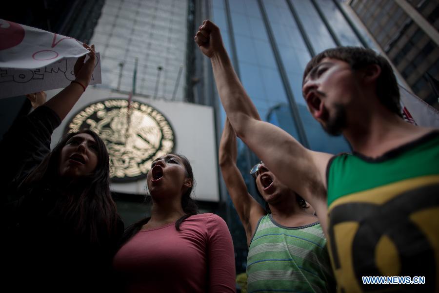 People take part in a protest for the 43 missing students of the Rural Normal School of Ayotzinapa in Guerrero, in front of the National Attorney General's Office in Mexico City, capital of Mexico, on Oct. 15, 2014. (Xinhua/Pedro Mera)
