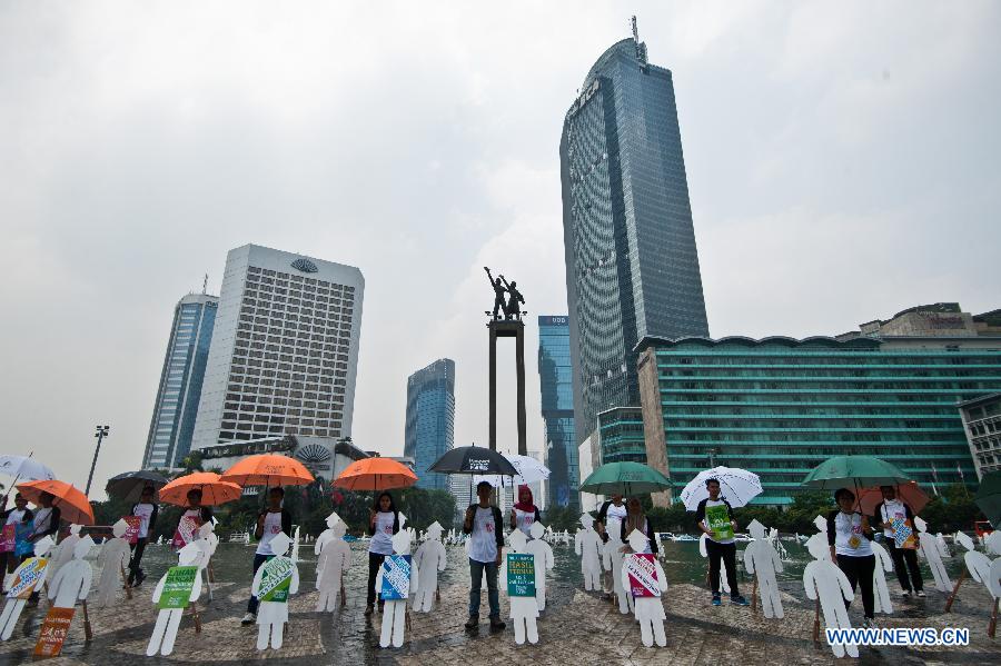 Activists stand next to statues of farmers during a rally marking the World Food Day in Jakarta, Indonesia, Oct. 16, 2014. (Xinhua/Veri Sanovri)