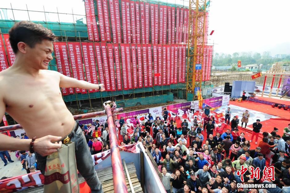 Two local real estate developers throw red envelopes containing more than $8,000 to the people as sales of their building began in Zhangjiajie, central China's Hunan province on Oct. 14. (CNS/Yang Huafeng)