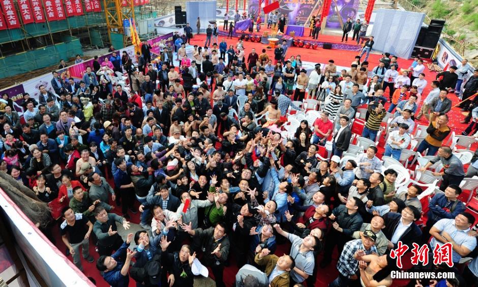 People scramble for the cash thrown by two local real estate developers in Zhangjiajie, central China's Hunan province on Oct. 14.(CNS/Yang Huafeng)