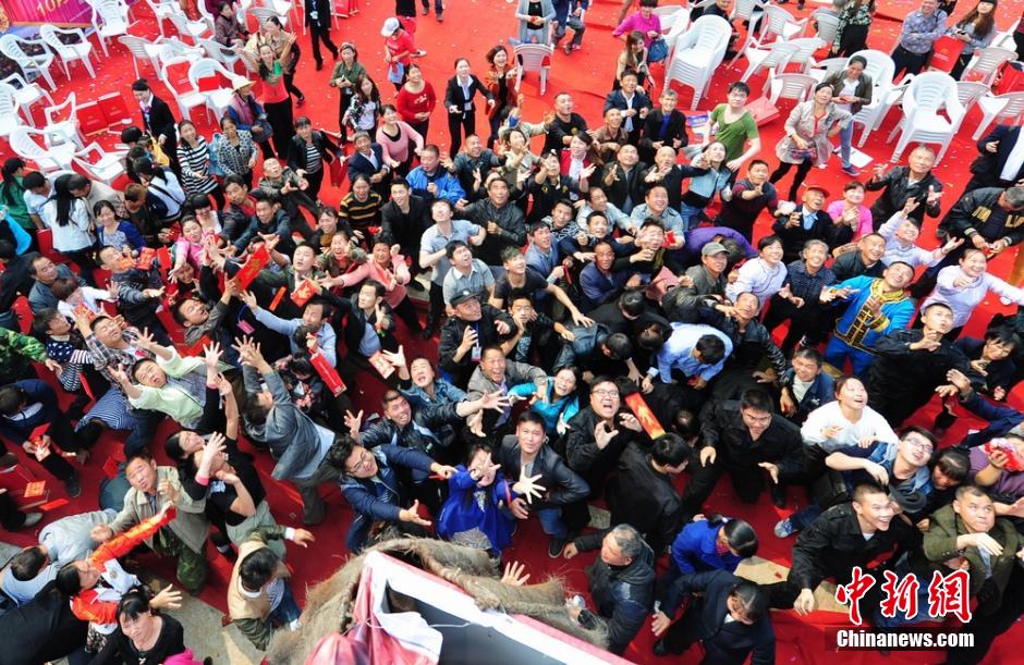 People scramble for the cash thrown by two local real estate developers in Zhangjiajie, central China's Hunan province on Oct. 14.(CNS/Yang Huafeng)