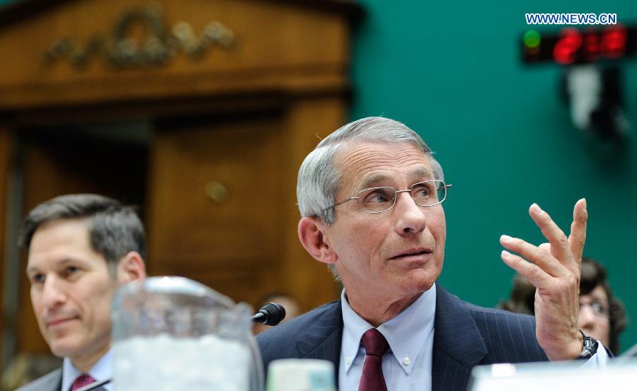 Anthony Fauci, director of the National Institute of Allergy and Infectious Diseases, part of the National Institutes of Health (NIH) testifies during a hearing on Examining the U.S. Public Health Response to the Ebola Outbreak before the Oversight and Investigations Subcommittee at Capitol Hill in Washington D.C., capital of the United States, Oct. 16, 2014. A hospital in Texas where an Ebola patient died and two nurses were infected apologized Thursday for mishandling the deadly disease, as the National Institutes of Health (NIH) prepared to treat the first nurse who contracted the virus while caring for the deceased. (Xinhua/Bao Dandan) |