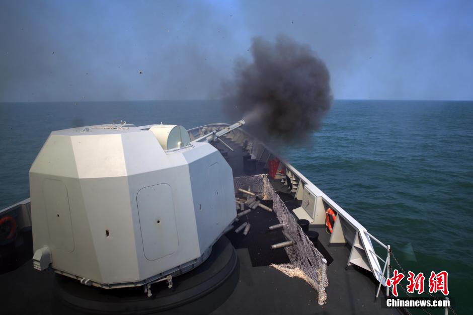 The newly-commissioned warship Quanzhou fires its main gun at the target in a maritime drill on October 15, 2014. Recently, the guided missile frigate Quanzhou of the East China Sea Fleet of the Chinese People's Liberation Army Navy (PLAN) has been engaged in coordination training with other warships of different types on various subjects including ship steering, refueling, ship towing and night navigation. This training is designed to verify the training effectiveness and speed up the generation of the combat capability of the frigate which was commissioned to the PLAN two months ago. (China News Service/Zhou Daoxian) |