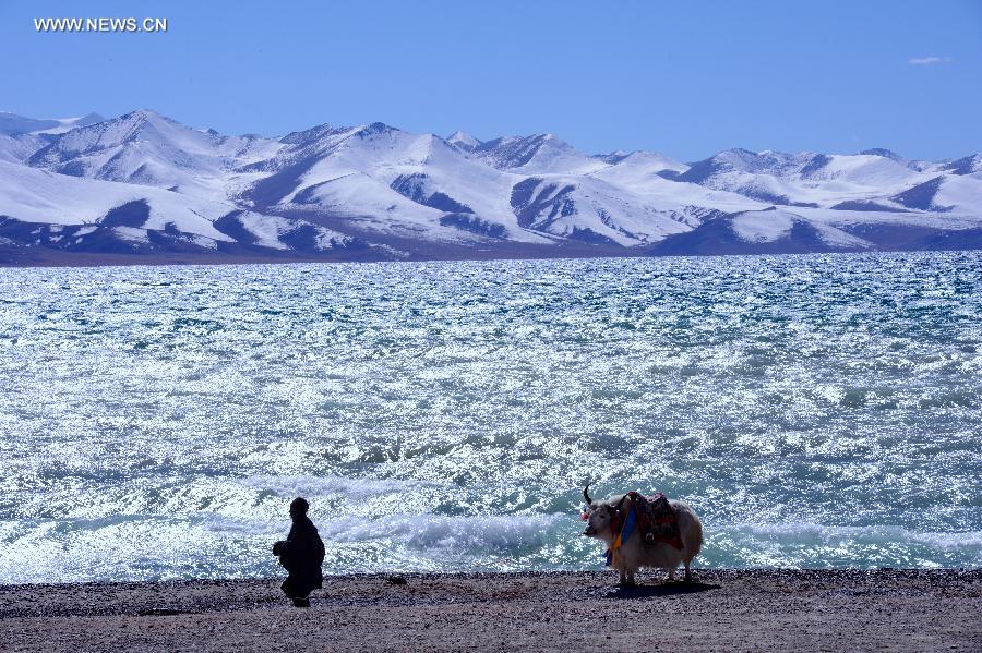 A Tibetan man walks by the Lake Namtso with a yak in southwest China's Tibet Autonomous Region, Oct. 17, 2014. (Xinhua/Zhang Guojun)