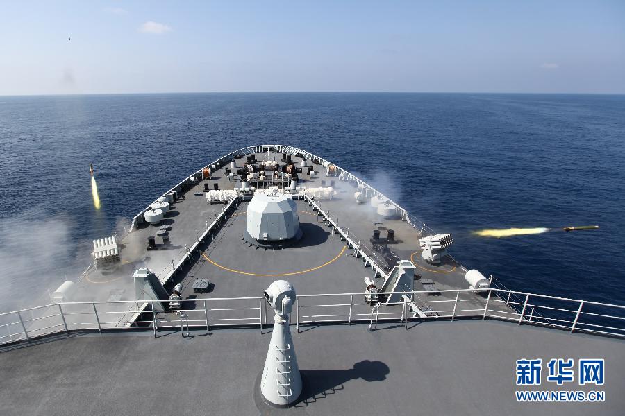 Chinese navy's Changbaishan Warship and Yuncheng warship conduct the air defense exercise in the Gulf of Aden and the waters off Somalia on Oct. 17, 2014. The two warships are part of the 18th batch of convoy fleet sent by the Chinese People's Liberation Army(PLA) Navy for escort missions in the Gulf of Aden. (Photo/Xinhua)