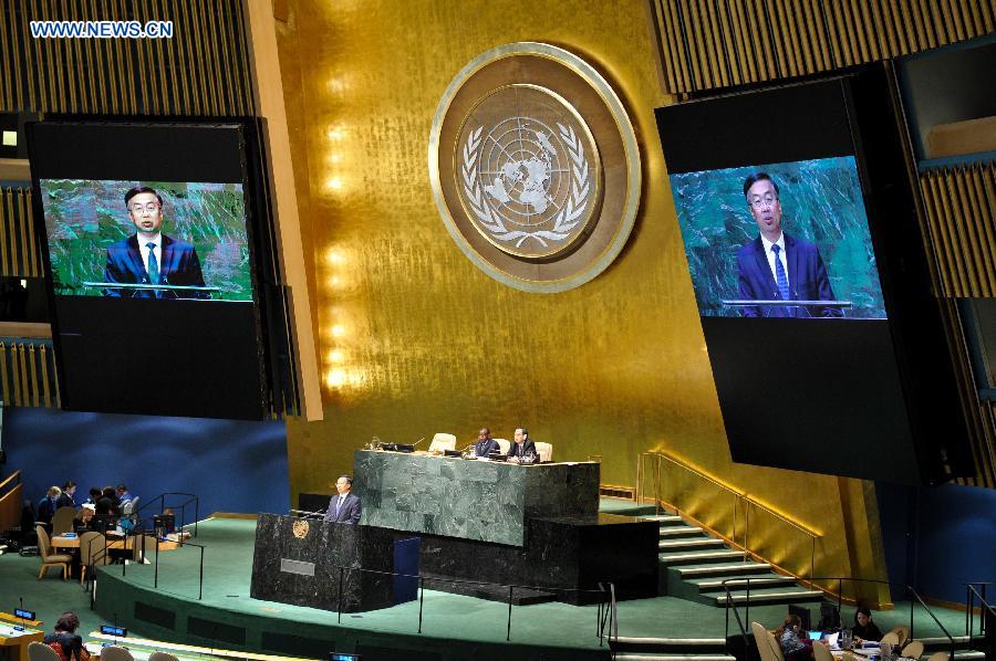 China's deputy permanent representative to the UN Wang Min delivers a speech during a meeting of the 69th Session of the UN General Assembly on Africa's development in New York, on Oct.17, 2014. Wang Min called for joint international efforts to fight the Ebola epidemic, saying the epidemic has become a common non-traditional security challenge to the international community. (Xinhua/Niu Xiaolei) |