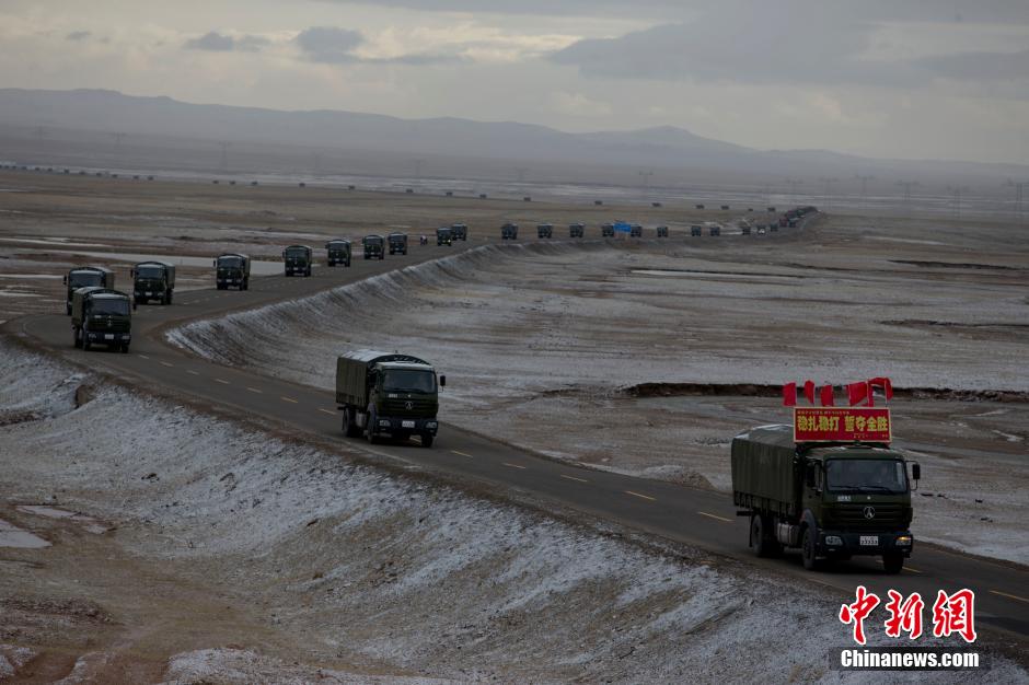 A regiment leaves from Tuotuohe army service station for Lhasa on Sept. 27, 2014. (Chinanews/Liu Guanguan)