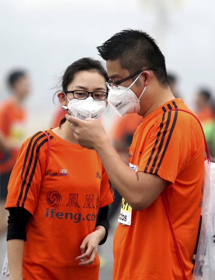 Two participants wear masks in the 2014 Beijing International Marathon in the haze-surrounded Beijing, capital of China, Oct. 19, 2014. (Xinhua/Wang Zhen)
