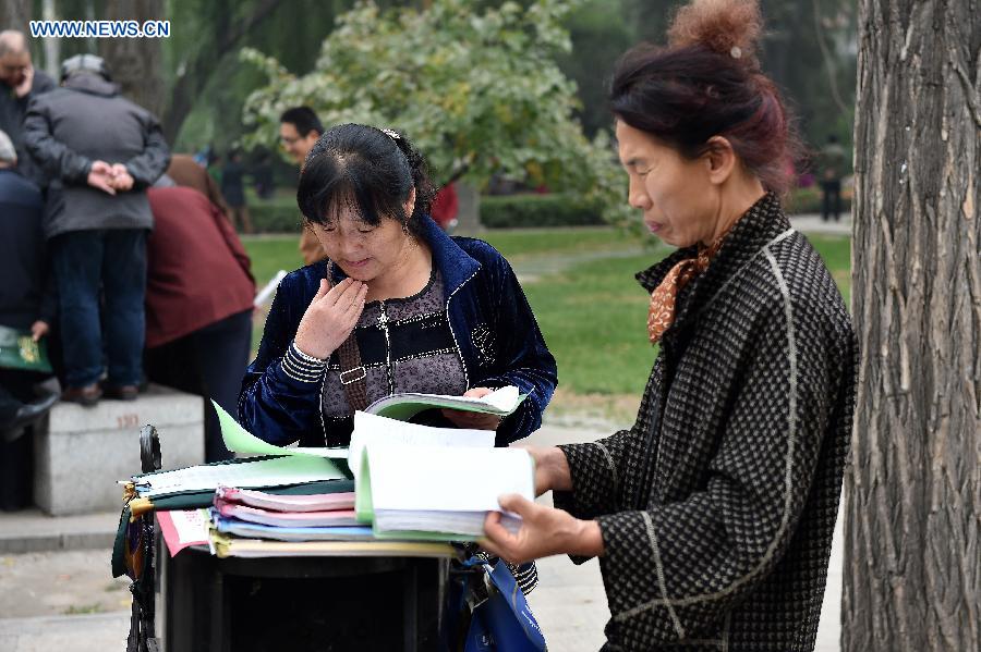 | Parents look through dating information in a blind date event at Yingze Park of Taiyuan, capital of north China's Shanxi Province, Oct. 19, 2014. The event attracted both young singles and parents who were eager to have their children married. (Xinhua/Zhan Yan) |