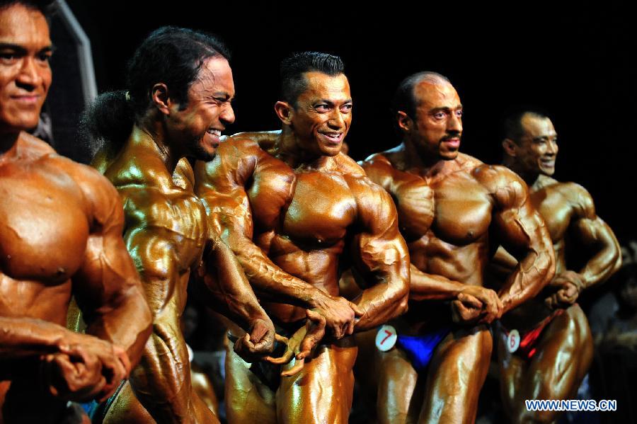Contestannts take part in the Fitwhey Classic 3.0 Bodybuilding Championship in Bangkok, Thailand, Oct. 19, 2014. (Xinhua/Rachen Sageamsak)