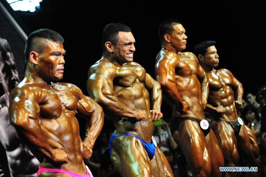 Contestannts take part in the Fitwhey Classic 3.0 Bodybuilding Championship in Bangkok, Thailand, Oct. 19, 2014. (Xinhua/Rachen Sageamsak)