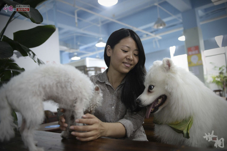 Lu plays with two dogs adopted by her colleagues at the company. (China.com.cn/Lai Xinlin)