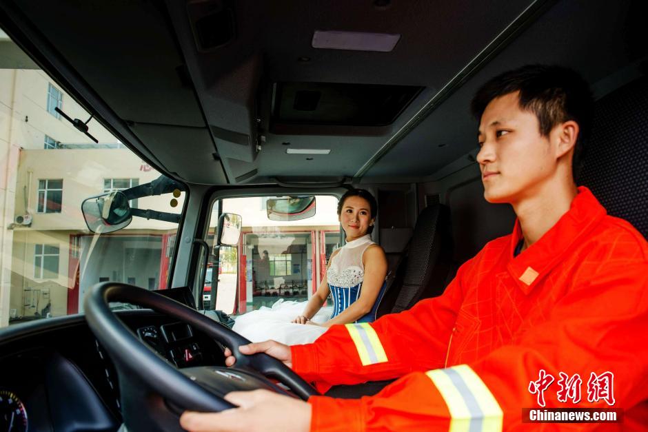 Wang Junwei, a firefighter in Huangdao District of Qingdao City, east China's Shandong Province, takes a group of wedding photos with his bride at his workplace, October 18, 2014. His colleagues, the fire trucks and the water hoses form a unique background for the photos. (CNSPHOTO/Jin Shaoyue)