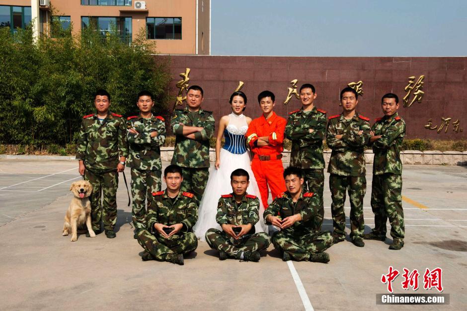 Wang Junwei, a firefighter in Huangdao District of Qingdao City, east China's Shandong Province, takes a group of wedding photos with his bride at his workplace, October 18, 2014. His colleagues, the fire trucks and the water hoses form a unique background for the photos. (CNSPHOTO/Jin Shaoyue) |