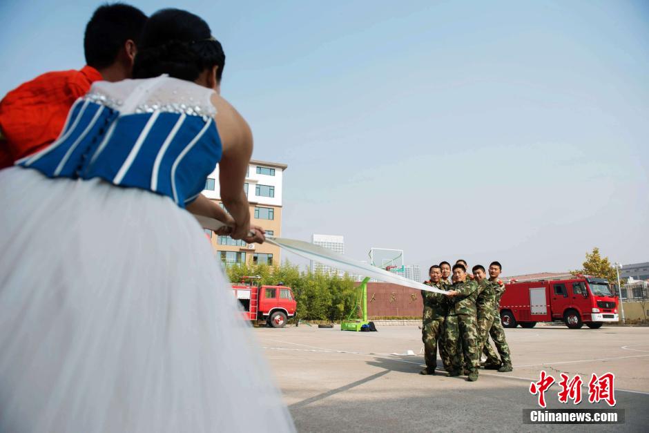 Wang Junwei, a firefighter in Huangdao District of Qingdao City, east China's Shandong Province, takes a group of wedding photos with his bride at his workplace, October 18, 2014. His colleagues, the fire trucks and the water hoses form a unique background for the photos. (CNSPHOTO/Jin Shaoyue)