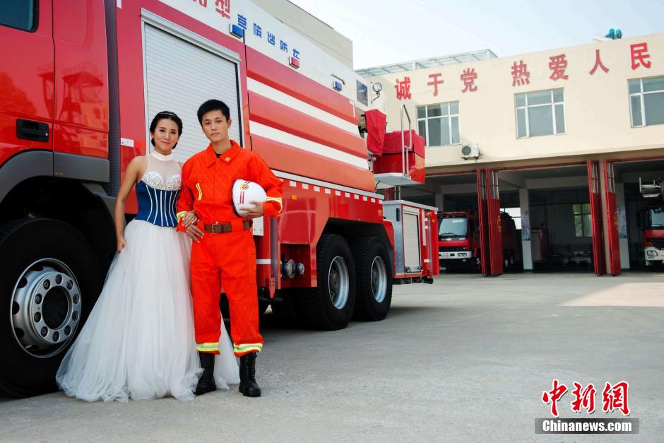 Wang Junwei, a firefighter in Huangdao District of Qingdao City, east China's Shandong Province, takes a group of wedding photos with his bride at his workplace, October 18, 2014. His colleagues, the fire trucks and the water hoses form a unique background for the photos. (CNSPHOTO/Jin Shaoyue)