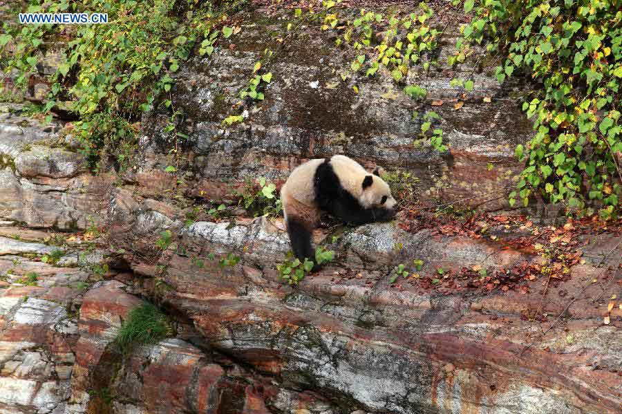 Photo taken on Oct. 19, 2014 shows a wild giant panda found at the Dajiangou scenic area in Huangbaiyuan Township in Taibai County of Baoji City, northwest China's Shaanxi Province. The wild panda appeared here on Sunday, according to a staff member of the local government. (Xinhua/Wang Li)