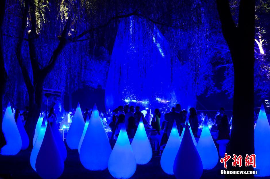 A one-week "Dancing Water Drops 2014" Art Exhibition kicks off in West Lake of Hangzhou, southeast China’s Zhejiang Province, Oct. 18, 2014. The whole group of works consists of five water drop models 12 to 20 meter in height floating on the lake and hundreds of small "water drops" placed on the park lawn, meaning "look at the world through water drops", to advocate the ecological concept of "protect water, love water, and cherish every drop of water". (CNSPHOTO/Li Zhong)